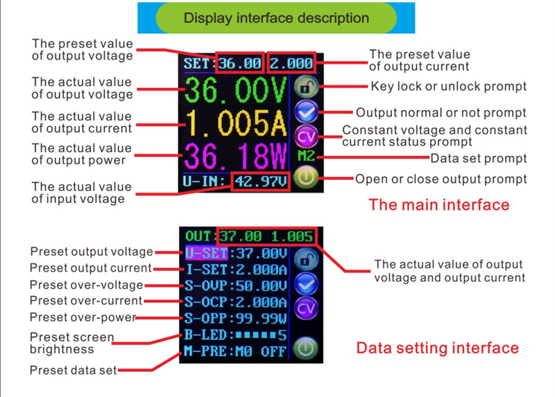| Set (short press) | Begin or Confirm/End setting current/voltage limit) |